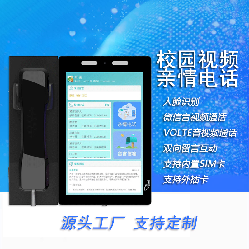 产品详细介绍产品功能: 1.家校互动:学生“刷脸”即可与家长进行音视频通话,支持双向留言互动。“指定亲情电话”方便学校管理。 2.校园公话:支持设置校内公话,如校园防欺凌电话,心理咨询电话,紧急联系电话,医务室电话等,以确保学生在遇到问题时可以第一时间联系老师。 3.无纸化请假:学生可在话机上发起请假申请,老师可在手机端对请假申请进行审批。 4.校园公告:学校可在话机上发布校园公告,学生可以不限时间不限场地,第一时间查看信息公告。 5.拨打时间和时段设置:很多住宿型学校会再宿舍楼安装校园电话。为了不影响学生的休息,校园视频电话支持设置拨打时段。比如晚上10点后禁止拨打电话,这样可以有效管理电话使用时段。 6.可扩充功能:食堂消费一卡通、智能储物柜、门禁系统等等