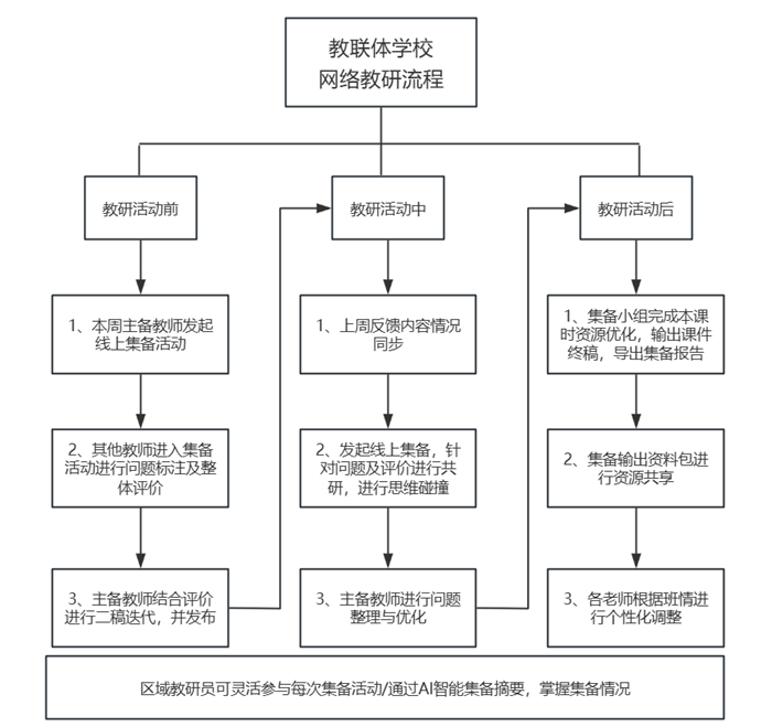 各教联体学校本着“共建、共赢、共享”的原则,充分应用在线教研工具,打造常态化线上线下相融合的集体备课与听课评课模式,并通过优化教研活动流程、提升异地同步教研效率,更好实现教学相长,进一步提升教联体各校区教学水平和教育质量。通过本学期的应用,也初步沉淀出了网络集体备课的开展范式: