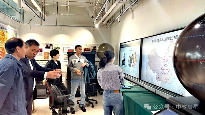 由于参与调研的领导对于中教启星地理领域的产品已经比较熟悉,石文宁老师就重点介绍了公司在历史学科方面的解决方案。利用全息技术、AR/VR技术及数字化手段,中教启星开发了一系列历史教学资源,如历史交互教学系统、文明的足迹VR教学系统、良渚遗址VR探究系统等,为老师减轻了备课授课负担,为学生提供了沉浸式的学习体验,极大地丰富了历史教学的内容和形式。
