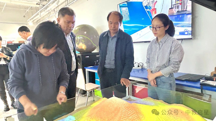 随后,各位行协领导到公司展厅进行了系列AR/VR产品体验和考察。来访领导体验了公司的地理AR沙盘、历史交互教学系统、裸眼XR学习系统等教学设备,对产品的创新性和实用性给予了高度评价。