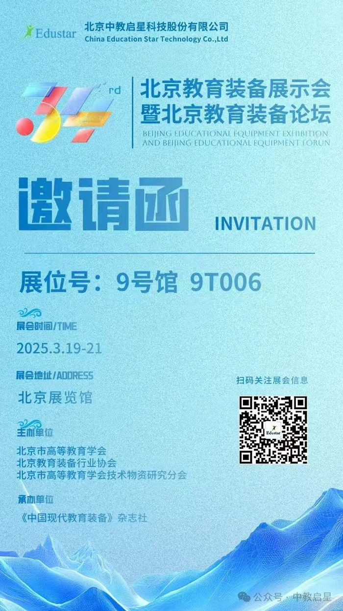 冬去春来,乍暖还寒,第34届北京教育装备展示会暨北京教育装备论坛将于3.19—21日在北京展览馆召开。在这个春光明媚的季节里,中教启星诚挚邀请您莅临,一同见证教育装备的创新与未来。