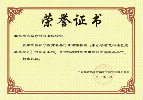 早在2018年,在中国教育装备行业协会的领导下,华文众合提出《中小学智慧书法教室装备规范》,并牵头制定该团体标准,开启智慧书法教育行业的新发展,促进现代科技与传统书法教育深度融合,为传统书法文化教育的发展提供新装备、新手段、新技术。