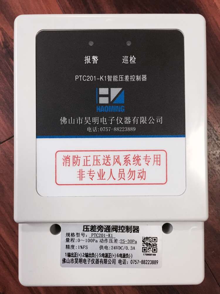 PTC201-K1楼梯间压力传感器技术参数 压力形式:差压,压差 测量范围:-100~100Pa 工作电压:24VDC/3A 精 度:1级 耐 压:1000Pa 动作压力:前室/走廊动作压力:30Pa,复位压力:25Pa 楼梯间/走廊动作压力:50Pa,复位压力:40Pa 显示说明:三位数字显示实测压差值 指示说明:绿色巡检,红色报警指示灯 输出方式:无源开关信号,24VDC/3A 过程连接:高压和低压孔均为内径3mm软管 管嘴连接:(H)高压端,(L)低压端