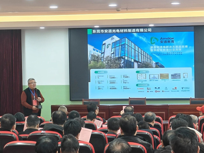 在展会期间还同期举办了新产品、新技术研讨会。安道教育北方大区销售总监耿东光受邀出席并发表主题为「安道教育全场景智慧教育解决方案」演讲。在演讲中,耿东光介绍了安道教育最新的公司发展情况,并结合当前邢台教育行业发展的一些痛点和现状提出了安道新解决方案。