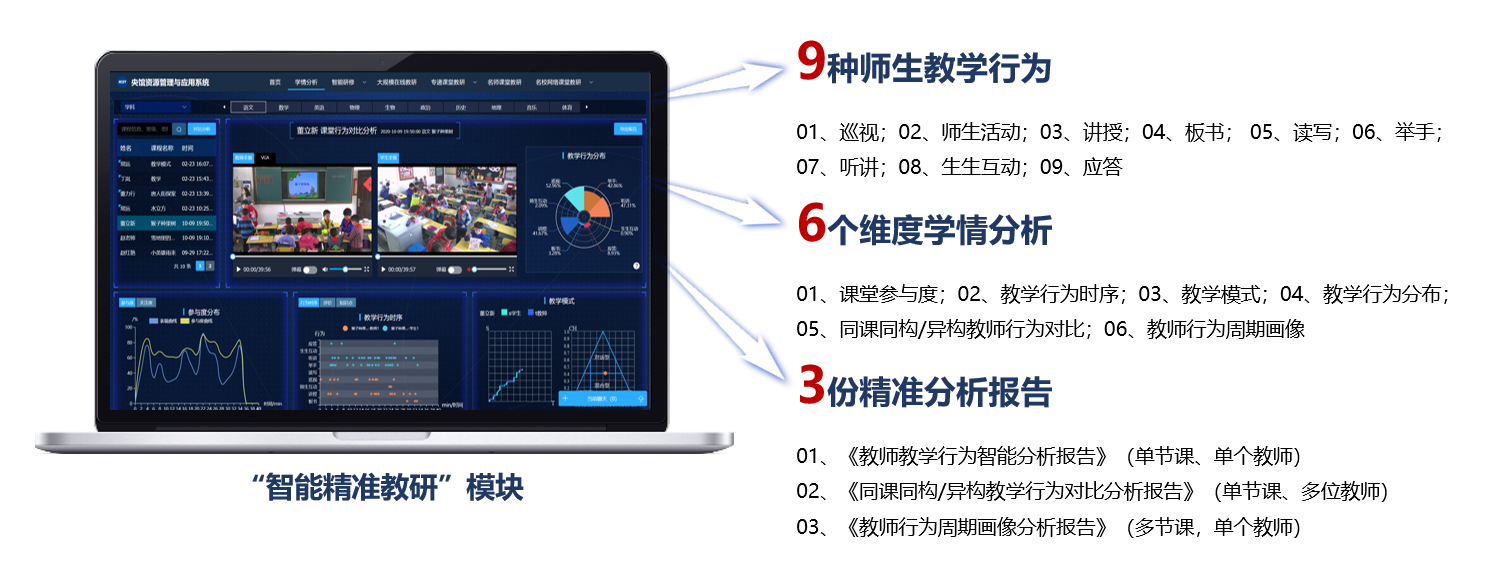 通过采集教师和学生的9种教学行为数据,包括巡视、师生互动、讲授、板书、读写、举手、听讲、生生互动和应答,中庆智能研修进一步从6个维度对这些数据进行分析,包括课堂参与度、教学行为时序、教学模式、教学行为分布、同课同构/异构教师行为对比、教师行为周期画像。