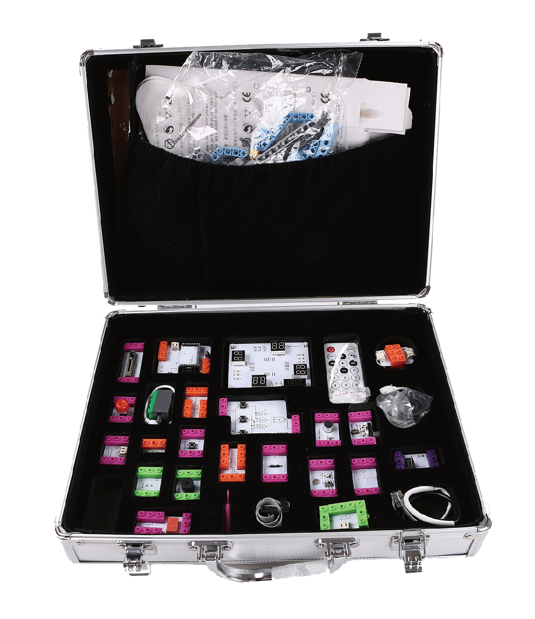 魔力百拼套装用模块化的电子器件拼接成各种物件。其中内置了许多编码的彩色原件:马达、滑动变阻器、蜂鸣器、传感器、电池,拼接起来,就可以制造出可靠好用的电路和系统。它对电路知识的要求基本为零,不需要编程、焊接这种反复工序,通过器材的特点只需要照着已有的结构图拼接,几分钟之内就可以实现自己所想。