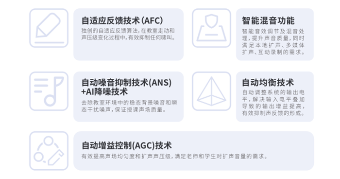 立达信教室健康无感扩声系统借助自研的自适应反馈技术(AFC)、自动噪音抑制技术(ANS)+AI降噪技术、自动增益控制(AGC)技术等音频处理技术,凸显人声,保障音质清晰舒适的同时,减少声音在空间内传播的幅值,实现均衡传播。