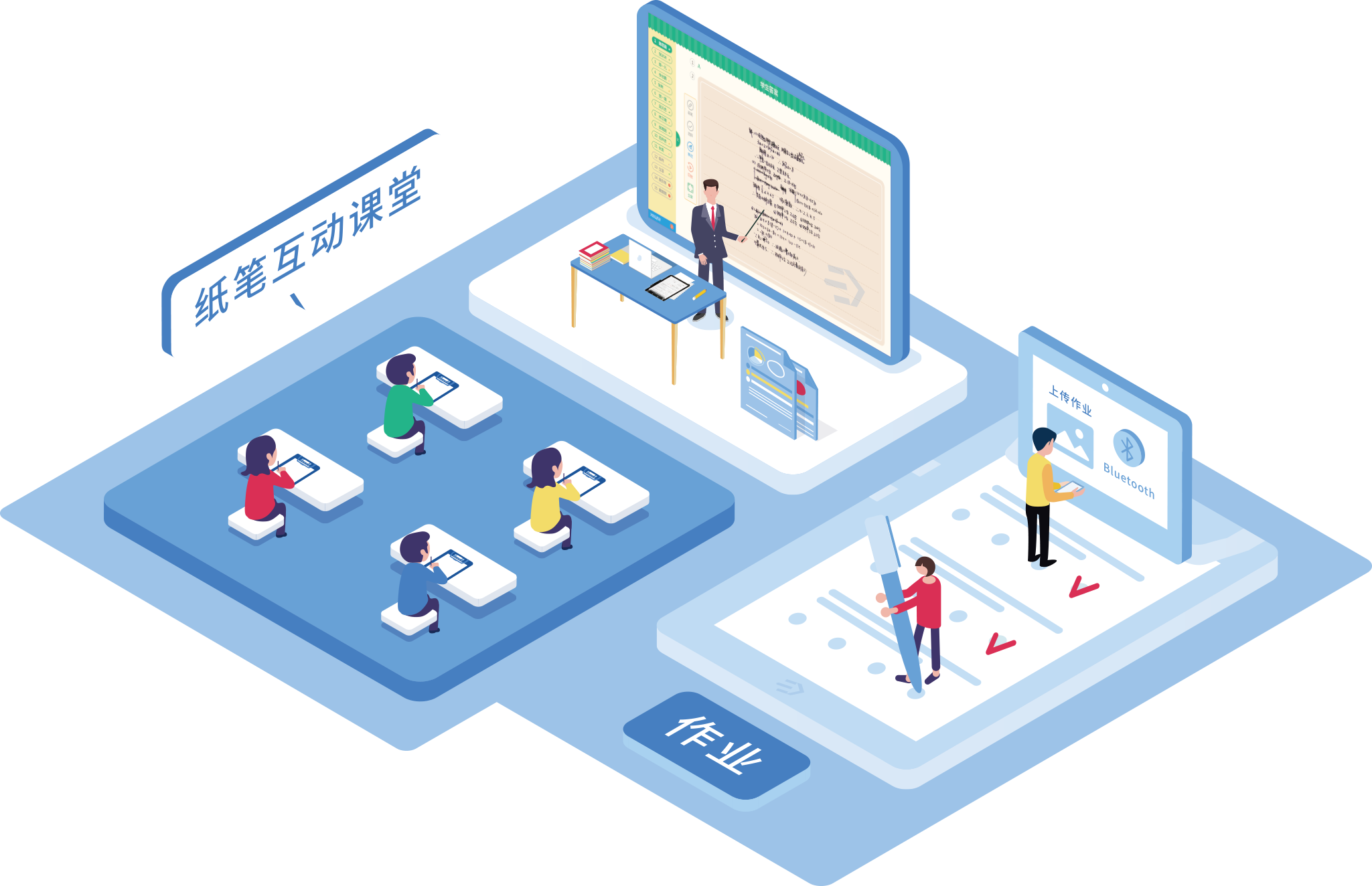 纸笔互动课堂以课堂教学需求为出发点,通过智能手写板(百分板)的快速接入,协助教师开展信息化课堂即时互动授课、纸笔板书、智能采集课堂数据,及时了解学生知识点掌握情况,实现针对性教学,让教师能关注到每一个学生。教学授课:支持PPT授课、导学案授课等多种授课模式。随堂练习:PPT截屏发布练习、导学案练习进行教学互动。随堂测验:导学案拆题练习,当堂点评学生卷面,答题报告即时分析。随堂听写:智能识别、播放听写内容,自动识别卷面判分。自动批阅:填空题智能识别答题字迹,自动批阅。对比讲评:学生答题同屏呈现,教师可对比讲评。纸笔板书:省时省力无粉尘,场地及版面不受限。