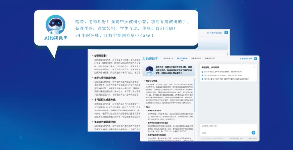 与AI进行深度对话,让优秀教师的经验与教育大模型碰撞产生出火花,是这次教研活动另一大亮点。教师们利用中庆AI教研助手软件,与AI助手(中庆教研小智)采用自然语言的方式,从课程设计、教学目标、教学方法等多个维度进行了深入探讨,基于新课标和生成式大模型,小智帮助提炼出课堂的教学亮点,厘清在跨学科融合方面的一些困惑,针对教学中的不足之处,更提供了情景化改进的建议和方案。
