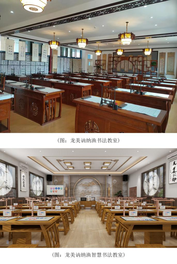 龙美讷纳渔书法教室是在完整保留传统书法学习功能的基础上,以书法基础练习为核心,教师和学生均配备有榫卯结构纯实木古典书法桌,毛笔、笔搁、笔洗、镇尺、砚台、宣纸、毛毡等书法用具,打造高标准专业书法教室,可满足各学段书法课程的授课与学习。且对书法教室空间进行了精心设计布局和装饰,营造出浓厚的书法艺术氛围。让学生在学习过程中自然而然地沉浸其中,感受书法的独特魅力。