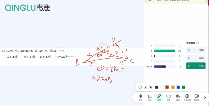在一节初中数学新授课——《利用特殊角构造直角三角形解决问题》上,梁老师灵活应用青鹿智慧纸笔系统开展教学,在课堂上实现了师生高效互动、学情及时反馈,展现了一节别开生面的智慧课堂。