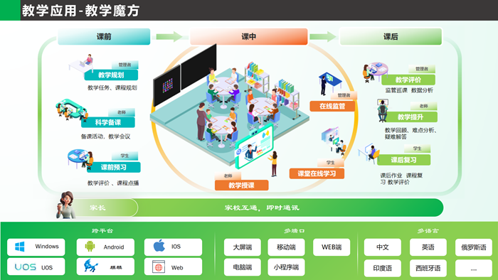 现场,安道除了展出了新的智慧教学设备外,还亮相了新的自研智慧教学应用软件「安道教学魔方」。教师在使用教学魔方时,可以借助AI实现一键快速备课,生成课件,还支持生成跨学科内容。作为高效赋能教学的多功能教学软件,教学魔方为管理者、教师、学生、家长多用户提供电脑端、移动端、小程序、网页等多终端提供全面的教学辅助平台,能够结合其他自研教学工具,贯穿课前、课中、课后三大教学环境全流程,丰富教学功能和模块,灵活组合,实现个性化课堂教学设计及信息资源流通共享,进一步提高教学质量。